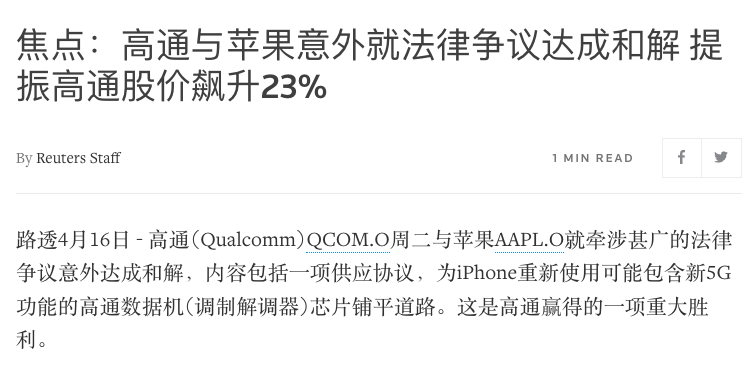 Reuters:焦點(diǎn):高通與蘋果意外就法律爭(zhēng)議達(dá)成和解 提振高通股價(jià)飆升23%