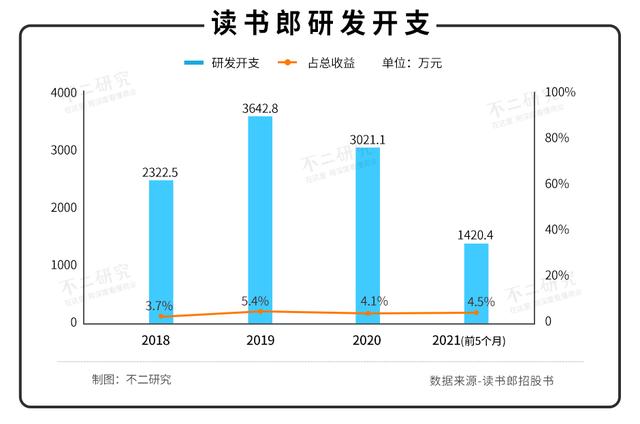 據(jù)招股書數(shù)據(jù)顯示,2018-2020年,及2021年前5個(gè)月,讀書郎的研發(fā)開支分別為2322.5萬元、3642.8萬元、3021.1萬元和1420.4萬元;分別占總收益的3.7%、5.4%、4.1%和4.5%。