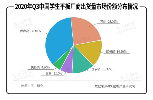 據(jù)IDC數(shù)據(jù),2020年Q3中國(guó)學(xué)生平板前5大廠商出貨市場(chǎng)份額中,行業(yè)TOP5占據(jù)約50%市場(chǎng)份額,集中度相對(duì)較高。其中,步步高以38.4%的占比處于首位,讀書郎以14.5%居于第二,但優(yōu)學(xué)派緊隨其后,占比13.3%。