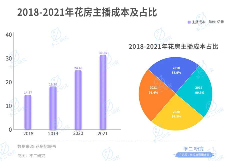 2018-2021年其主播成本分別為14.87億元、19.20億元、24.46億元、30.85億元;分別占總銷售成本的87.9%、90.3%、91.5%、91.4%。