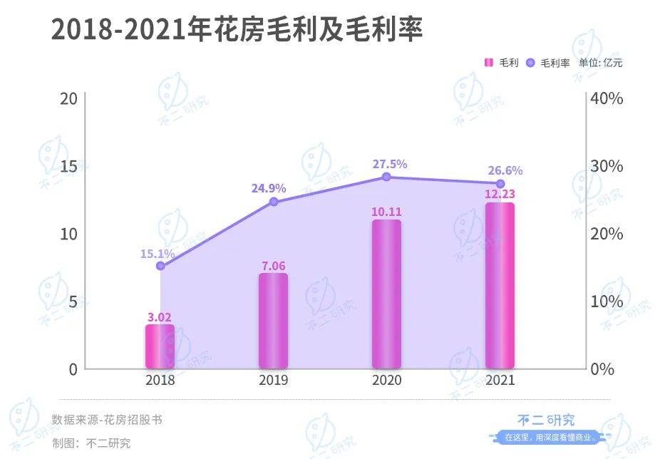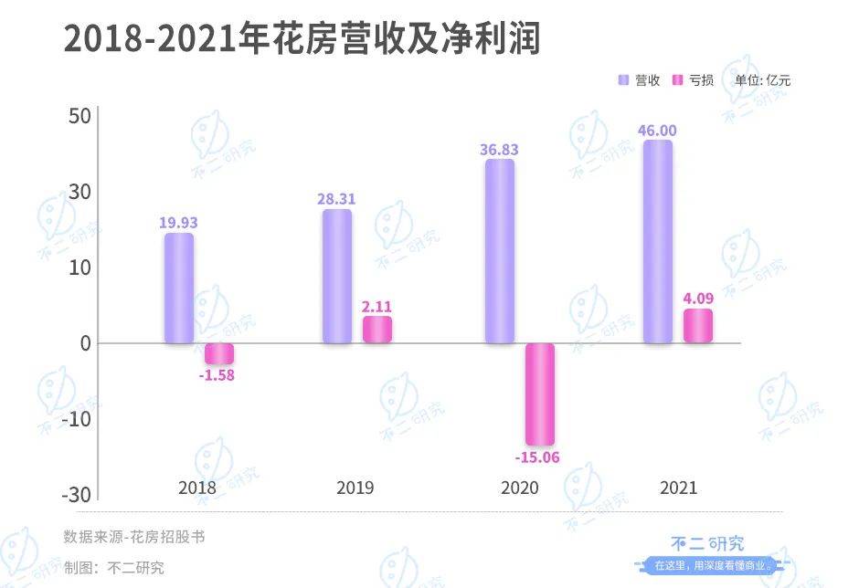 招股書顯示,2018-2021年花房的收入分別為19.93億元、28.31億元、36.83億元、46.00億元,營收一直處于穩步上漲趨勢。