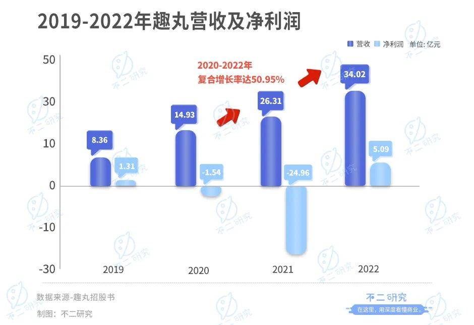 「不二研究」據其新版招股書中發現:2022年,趣丸的營收為34.02億元,同比增加29.30%;同期,凈利潤為5.09億元,實現扭虧為盈。