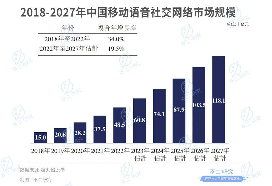 招股書顯示,2022年中國移動語音社交網絡市場的規模達到485億元,預計將以19.5%的復合年增長率,2027年增長至1181億元。