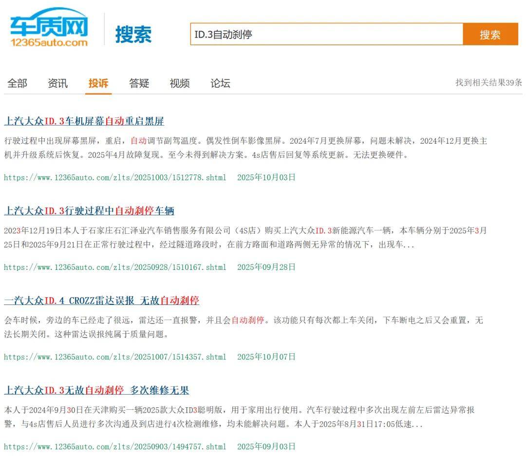 經(jīng)銷商與廠方的檢測結(jié)果令人咋舌——“系統(tǒng)正常”,無故障記錄。這樣的答復(fù),對于經(jīng)歷生死一瞬的車主來說,無疑是冷漠與不負責(zé)任。車質(zhì)網(wǎng)數(shù)據(jù)顯示,ID.3自動剎停投訴已超20起,且多發(fā)生于隧道或光線復(fù)雜路段,傳感器誤判成為主因。一位車主無奈表示:“購車前最好試一趟隧道,看系統(tǒng)敢不敢信。”這句話,透露出車主對ID.3智能系統(tǒng)的深深不信任。