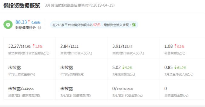 具有同樣壯士斷腕勇氣的還有懶投資,據網貸天眼最新數據顯示,2019年3月懶投資總成交額下降9.2%,但利息余額有小幅度的上升,凈資金流入下調61.2%,當前借款人3.91萬人,總借款人513萬人。懶投資的數據健康評分也上升到了88.3分,漲幅達9.66%。