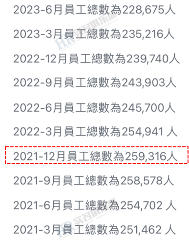 (數據來源:阿里23財年報)即,23年1-6月份,阿里已裁減11065員工。可以看連續10個季度,阿里巴巴員工變化情況,人數最高是21年12月,25.9萬人,22-23年一路裁減、瘦身。