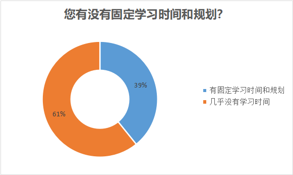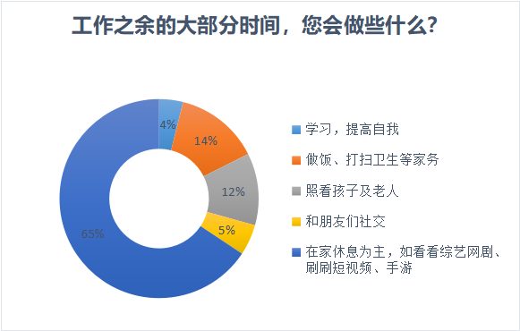 如今,娛樂(lè)正以黑云壓城之勢(shì)侵蝕一代人的生活與學(xué)習(xí)。近日,有企業(yè)在“問(wèn)卷星”平臺(tái)發(fā)起問(wèn)卷調(diào)查,面向各行業(yè)近萬(wàn)名職員,打響了一場(chǎng)探尋《下班后時(shí)間去哪了》的深度調(diào)研,發(fā)現(xiàn)超60%的員工沒(méi)有固定的學(xué)習(xí)時(shí)間和規(guī)劃;超65%的員工將下班后的時(shí)間消磨在各種娛樂(lè)中,比如短視頻平臺(tái)、手游、網(wǎng)劇綜藝等;80%以上的人一星期所有學(xué)習(xí)時(shí)長(zhǎng)不足5個(gè)小時(shí);而只有4%的員工有機(jī)會(huì)接觸到職場(chǎng)職業(yè)技能培訓(xùn)。