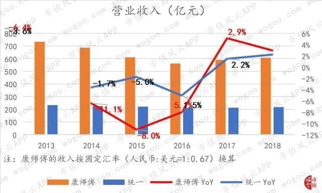 2017年,兩家企業走出寒冬,開始恢復增長。2018年,康師傅和統一的營收分別同比增長2.9%和2.2%,增幅相近。