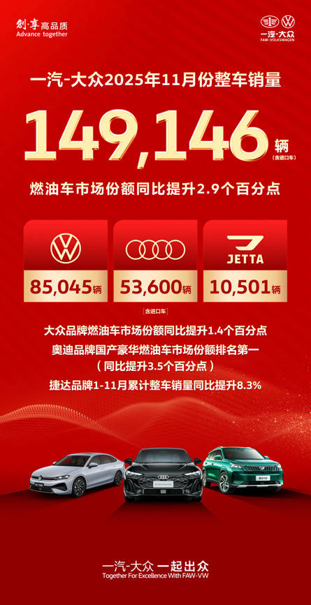 12月1日,一汽-大眾發(fā)布最新銷量業(yè)績:11月實現(xiàn)整車銷售149,146輛(含進口車),燃油車市場份額同比提升2.9個百分點。