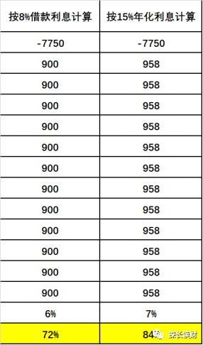 以車輛抵押借款10萬元本金計算,一次性扣除擔(dān)保費(fèi)及服務(wù)費(fèi)5000元,借款人如果支付年化15%的利率,按IRR計算,車貸借款人承擔(dān)的年化利率恰好是36%。如果按最低年化利率8%計算,則車貸借款人承擔(dān)的年化利率為24%。