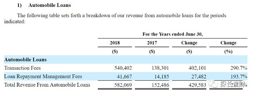 招股書顯示,車貸業(yè)務(wù)收入主要包括兩部分來源,一是交易費(fèi),二是逾期管理費(fèi)。例如,截止2018年6月30日,公司車貸交易費(fèi)收入為54萬美元,逾期管理費(fèi)約4.2萬美元,后者約占車貸總收入的7%。
