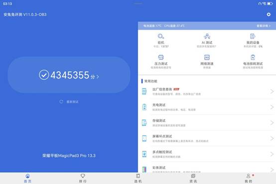 在安兔兔跑分測(cè)試中,榮耀MagicPad3 Pro輕松達(dá)到了434萬(wàn)分,這一成績(jī)?cè)谕瑱n平板中遙遙領(lǐng)先,堪稱(chēng)年度性能“天花板”。無(wú)論是運(yùn)行大型游戲還是處理多任務(wù),都能輕松應(yīng)對(duì),流暢不卡頓。