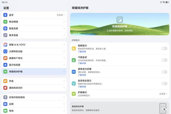 此外,屏幕還搭載了榮耀自研的八大護(hù)眼技術(shù),包括AI離焦護(hù)眼、AI干眼友好、全局DC調(diào)光、自然色彩顯示、類(lèi)自然光護(hù)眼、暈動(dòng)舒緩顯示、AI助眠顯示和硬件級(jí)低藍(lán)光等,全方位保護(hù)用戶(hù)的用眼健康,即使長(zhǎng)時(shí)間使用也不會(huì)感到眼睛疲勞。