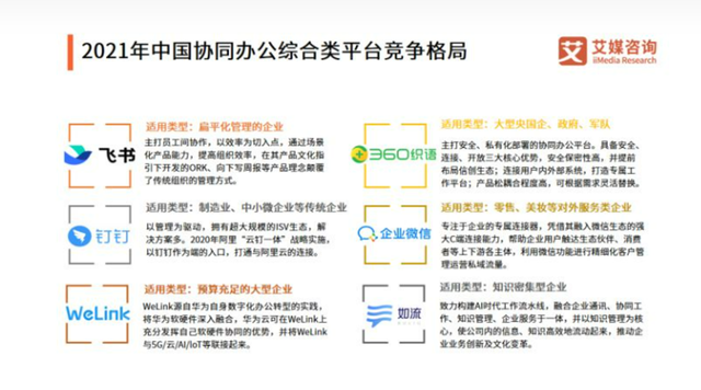 當前,市場主要分為以泛微、致遠、藍凌等為代表的傳統老牌軟件廠商,通過數年發展,這些企業積累了技術實力和客戶。另一派就是互聯網企業,比如釘釘、企業微信、360織語等,這幾家背靠巨頭,在流量端都有得天獨厚的優勢。
