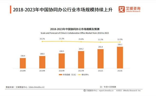 iiMedia Research(艾媒咨詢)數據顯示,2021年中國協同辦公市場規模達264.2億元。預計2021-2023年,中國協同辦公行業將保持每年10%以上的增長率,2023年的市場規模將達330.1億元。