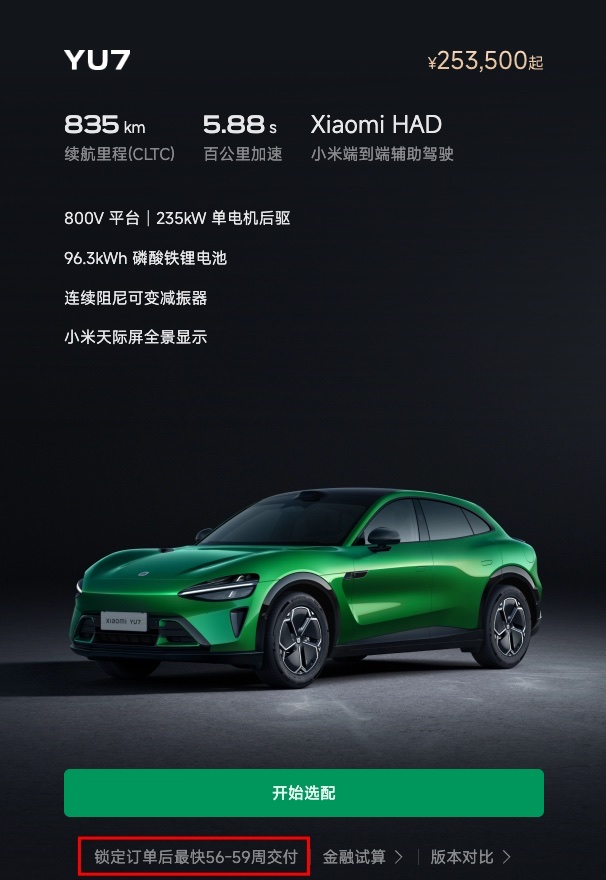 從小米汽車官網了解到,如果現在下定YU7的標準版,則需要等待56-58周的時間才能交付,也就是超過一年的時間。小米YU7的火爆也催生出了二手市場的火爆,TechWeb了解到,目前有大量的YU7訂單在咸魚、轉轉等二手平臺轉賣,加價3000~10000不等轉讓訂單,最高的加價到4萬的準現車。