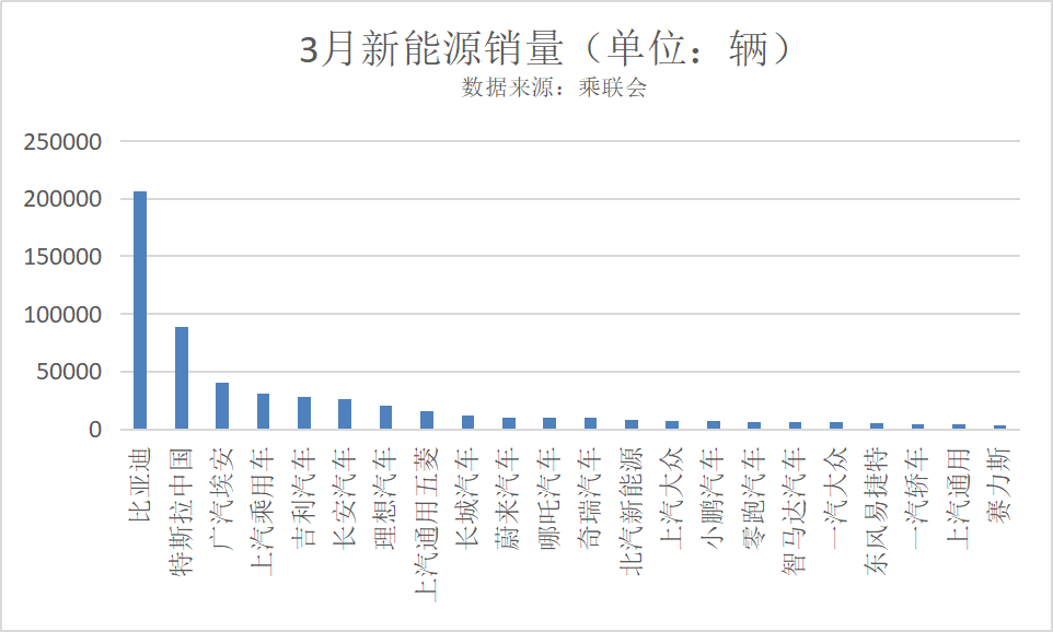 根據(jù)乘聯(lián)會數(shù)據(jù)顯示,剛剛過去的3月,除了比亞迪之外,新能源汽車銷量排行榜上,特斯拉依舊以7.7萬量的銷量遙遙領先一眾品牌。