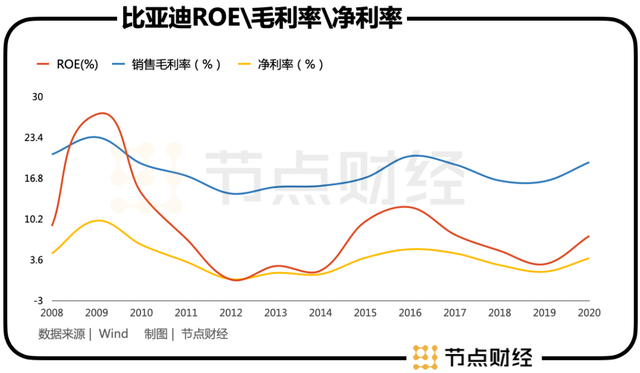 拉長(zhǎng)時(shí)間線(xiàn),比亞迪的利潤(rùn)數(shù)據(jù)也不漂亮,近十年凈利率維持在5%以下,銷(xiāo)售毛利率基本在20%以下,ROE基本在10%以下,同時(shí)從2016年這幾個(gè)值也在持續(xù)下降,盡管2020年有轉(zhuǎn)好的趨勢(shì),但根據(jù)三季報(bào)的數(shù)據(jù)來(lái)看,今年也不樂(lè)觀。