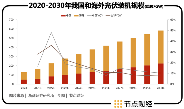 但2021終端還是發(fā)展的不及預(yù)期,但近期隨著硅料價(jià)格回落、產(chǎn)業(yè)鏈成本下降,以及風(fēng)光大基地項(xiàng)目、整縣推進(jìn)政策等需求支撐預(yù)計(jì)將帶動(dòng)2022年光伏終端需求復(fù)蘇。瑞銀預(yù)計(jì)2022年國(guó)內(nèi)光伏裝機(jī)將新增80GW。全球光伏新增裝機(jī)量預(yù)計(jì)至200GW。浙商證券預(yù)測(cè)見(jiàn)圖