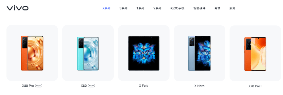 X 系列主打蔡司影像旗艦, S 系列主打前置拍照美顏, iQOO 主攻游戲領(lǐng)域, Y 系列和新晉的 T 系列主打中低端性價(jià)比,上上下下全都覆蓋到了。