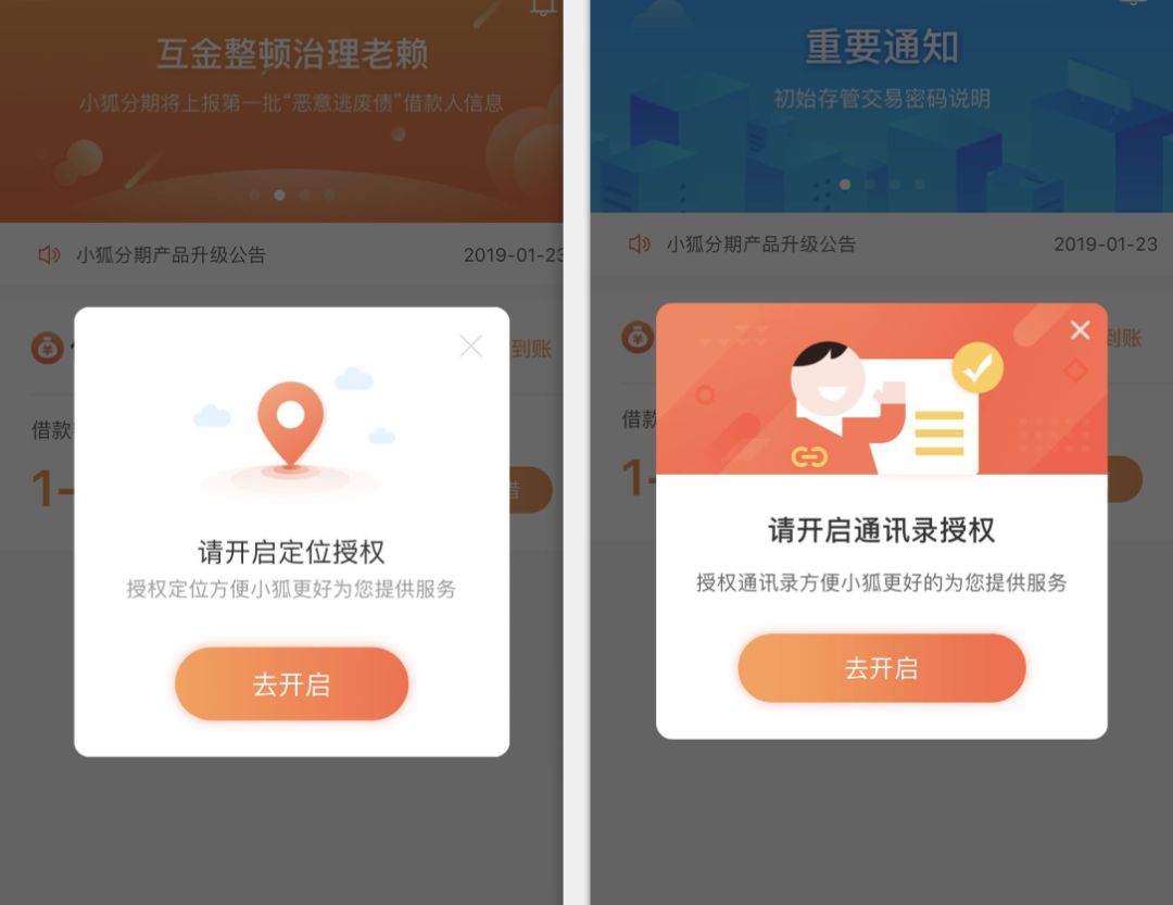 除了房產抵押類標的,還有部分借款人來自于搜易貸平臺自營的消費信貸產品“小狐分期”。經過體驗發現,小狐分期平臺僅提供信用卡借款一種服務,且需要用戶授權通訊錄權限與定位授權。