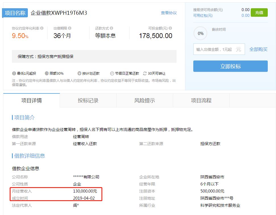 其中,“企業借款XWPH19GM0A”對應的借款企業位于陜西省西安市未央區,注冊于2019年4月1日,注冊資本為100萬元,法定代表人為“王**”。但根據企查查提供的工商信息顯示,并無對應滿足要求的企業。