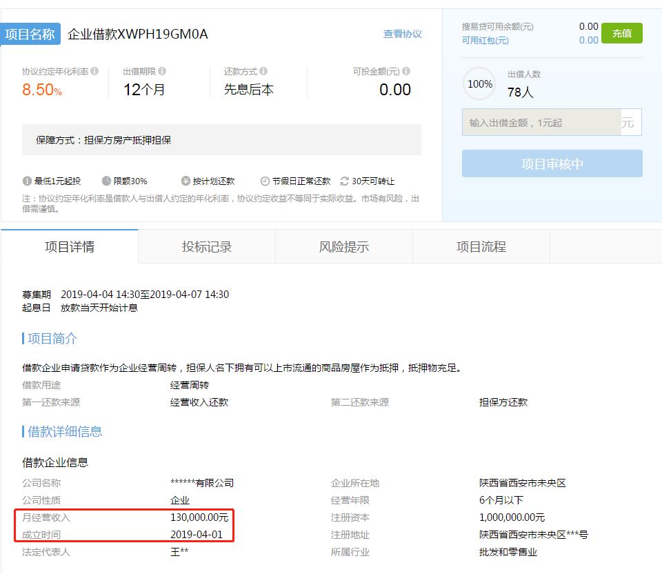 不僅如此,在互聯網金融新聞中心詢問情況后,搜易貸平臺仍繼續發布當月注冊成立公司的借款標的。信息顯示,搜易貸4月4日發布的“企業借款XWPH19GM0A”、“企業借款XWPH19T6M3”等均為2019年4月注冊的企業。