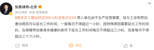 熱搜信息顯示,有網友爆料,其入職蔚來汽車三年,經常加班。半年內有文檔證據的加班就500小時。