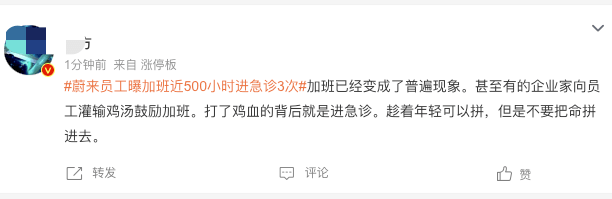 繼猿輔導單日加班超6小時的熱搜后,今日,造車新勢力之一的蔚來,又因高強度加班沖上熱搜前十。