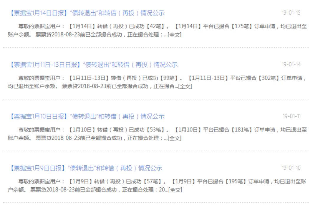 獨角金融發現,票據寶每天都會發布債轉的情況。不過轉借(再投)筆數和退出筆數并不對應,按照官方的說法,由于每筆退出和每筆轉借(再投)金額均由用戶自主設定,并不一一對應,所以退出筆數和轉借(再投)筆數不會一致。