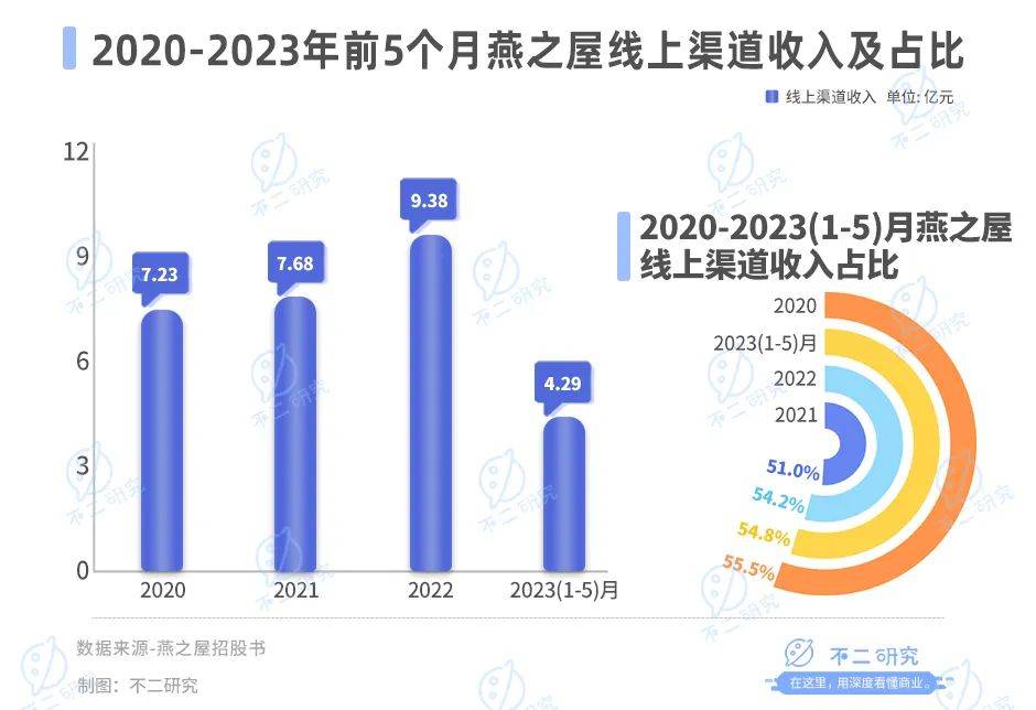 據(jù)燕之屋招股書(shū)顯示,2020-2022年及2023年前5個(gè)月,其線上渠道的營(yíng)業(yè)收入分別為7.23億元、7.68億元、9.38億元和4.29億元;營(yíng)收占比分別為55.5%、51.0%、54.2%和54.8%。