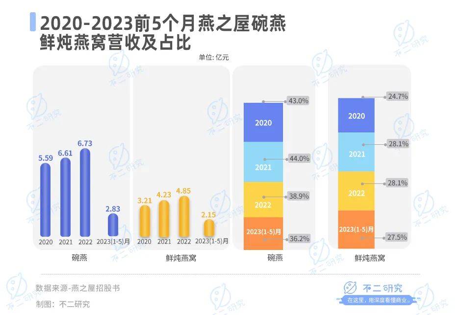 與此同時(shí),鮮燉燕窩品類(lèi)快速崛起。2020-2022年及2023年前5個(gè)月,鮮燉燕窩銷(xiāo)售收入分別為3.21億元、4.23億元、4.85億元和2.15億元,同期營(yíng)收占比為24.7%、28.1%、28.1%和27.5%,2021年、2022年的同比增幅31.78%、14.66%。