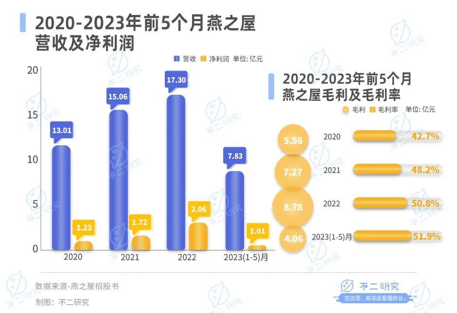 據(jù)招股書(shū)顯示,2020-2022年及2023年前5個(gè)月,燕之屋營(yíng)收13.01億元、15.06億元、17.30億元和7.83億元;凈利潤(rùn)分別為1.23億元、1.72億元、2.06億元和1.01億元。