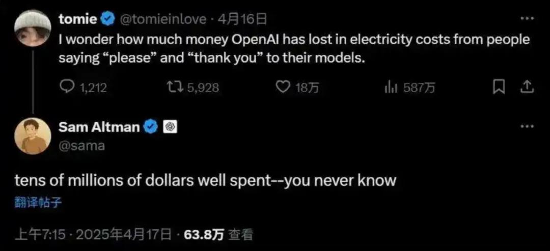 OpenAI創始人山姆·奧特曼的一句估算,讓全球用戶陷入沉默:每年因用戶對AI說“請”和“謝謝”,產生的額外電費高達數千萬美元。
