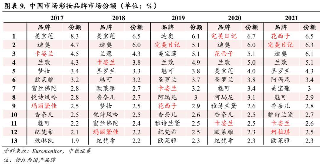 完美日記被正式推出在2017年,也正是從這一年開始整個(gè)國貨美妝行業(yè)高歌猛進(jìn)。百雀羚和自然堂在2017年天貓雙11榜單上名列前茅,到了2019年有589個(gè)國貨美妝品牌在天貓618當(dāng)日成交額同比增長超過100%。2021年時(shí),花西子和完美日記已拿下中國彩妝市場品牌市占率TOP1和TOP2,超越海外品牌。