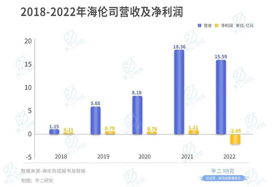 根據招股書及財報,海倫司在2018年-2022年的營收分別為1.15億元、5.65億元、8.18億元、18.36億元和15.59億元, 2018年-2022年調整后的凈利潤分別為0.11億元、0.79億元、0.76億元、1.11億元和-2.45億元。