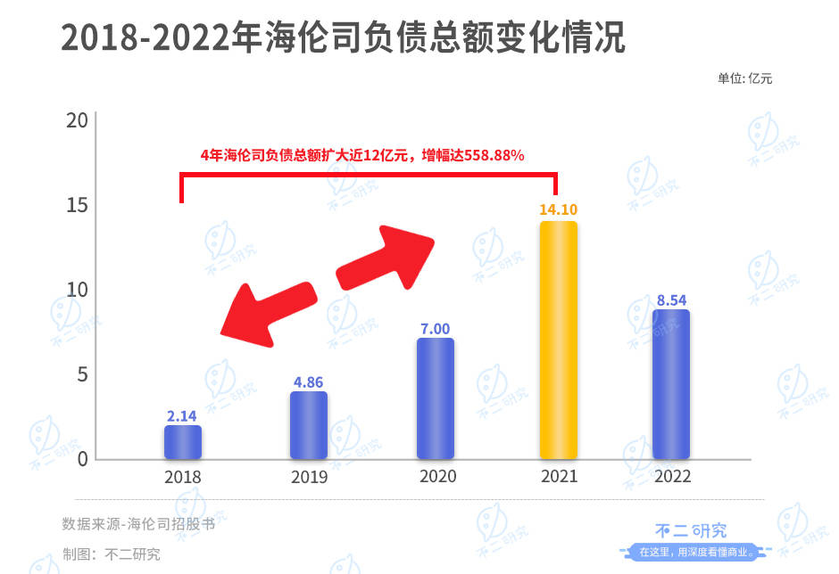 與此同時,從2018年-2021年海倫司的負債總額從2.14億元升至14.10億元。 與2018年相比,4年間,海倫司負債總額擴大近12億元,增幅達558.88%。