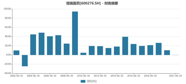 節(jié)點(diǎn)財(cái)經(jīng)查閱其歷年半年報(bào)發(fā)現(xiàn),除了2003年歸屬凈利潤下降24.56%,2010年歸屬凈利潤增長4.81%,恒瑞醫(yī)藥在其余年份的凈利潤增速均保持在兩位數(shù)以上。
