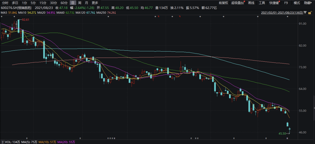 8月23日收盤,恒瑞醫(yī)藥股價(jià)定格在47.18元/股,全天下跌2.64%。而就在上周五(8月20日),因當(dāng)天發(fā)布的半年報(bào)不及市場(chǎng)預(yù)期,恒瑞醫(yī)藥開盤迅速封死跌停,連帶整個(gè)醫(yī)藥、醫(yī)療保健板塊“崩盤”。