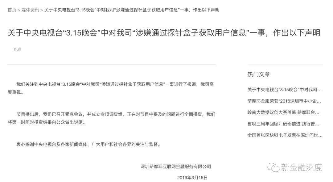 針對中央電視臺3?15晚會報道薩摩耶金服“涉嫌通過探針盒子獲取用戶信息”一事,現將查明的結果,向薩摩耶金服的用戶、合作伙伴及所有關心我司的朋友們做出以下說明: