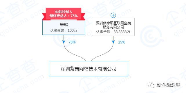 新金融頭條通過企查查發現,實際上,薩摩耶金服為紫康網絡的第二大股東。企查查資料顯示,紫康網絡成立于2016年12月16日,實際控制人為康超,持股75%;而薩摩耶金服為第二大股東,持股25%。認繳金額為33.3333萬元。
