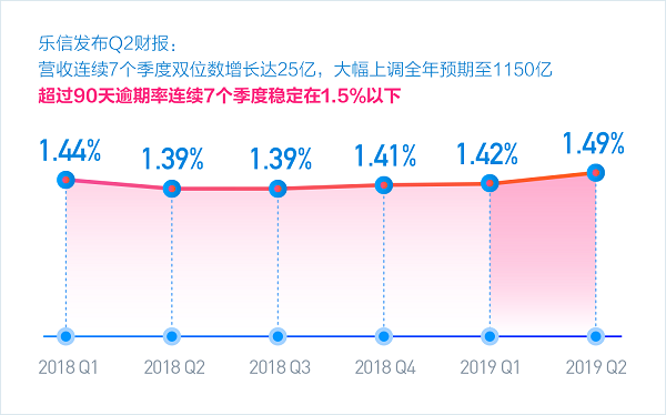 用戶的強勁增長,帶動樂信業務規模大幅上漲。2季度,樂信平臺促成借款260億元,比去年同期166億增長57%;在貸余額406億,比去年同期247億增長64.5%。資產質量持續表現保持穩定,超過90天的逾期率為1.49%。