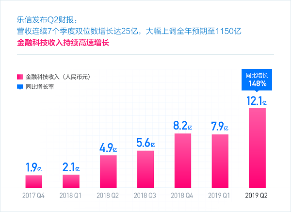 金融科技收入依然是樂信增長最快的部分。2019年2季度,樂信通過為各類金融機構服務獲得的金融科技收入達到12億,比去年同期4.9億增長148%。