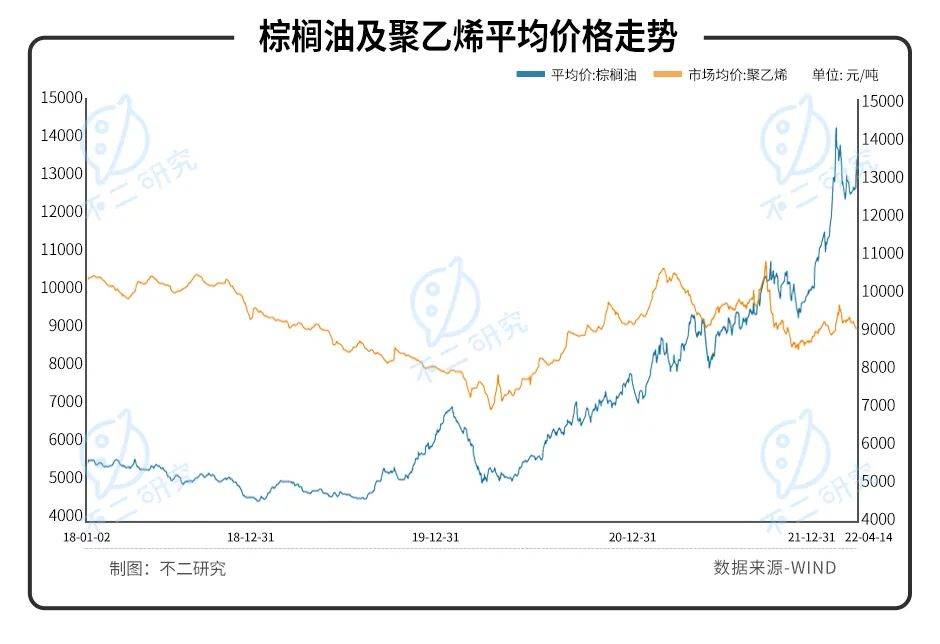 但wind最新數據顯示,自從2020年初,棕櫚油開始一路飆漲,最高價格已超14000元/噸;聚乙烯價格也震蕩上行,當前均價逼近9000元/噸。據年報數據,2021年藍月亮的原材料成本由去年同期22.56億港元漲至26.96億港元,漲幅高達19.50%。