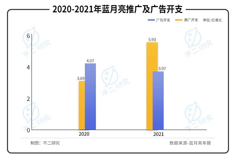 2021年,藍月亮用于在線渠道的宣傳開銷顯著提升,僅推廣開支一項就高達5.93億港元,相較于2020年的3.69億港元,同比激增60.70%。另外廣告開支也一直居高不下,2021年僅廣告費支出就超過3.97億港元,二者之和幾乎與2021年藍月亮的凈利潤數值相當。