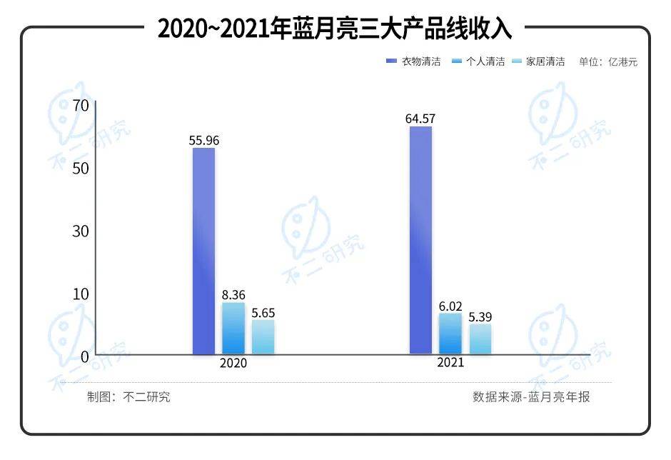 衣物清潔即洗衣液,是藍月亮的拳頭產品。財報顯示,2021年的衣物清潔的收入為64.57億港元,占比總收入比重高達84.99%。個人清潔即洗手液,家居清潔即消毒產品,2021年收入分別為6.02億港元和5.39億港元,均是藍月亮成為“洗衣液一哥”前的老爆款。