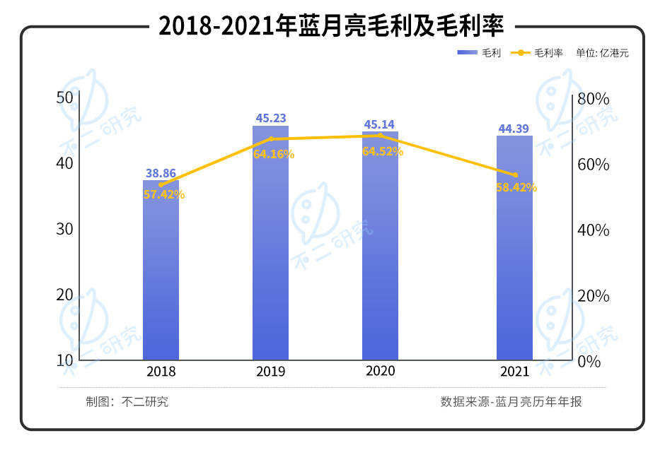 同時,藍月亮的毛利和毛利率也齊聲下跌。年報顯示,2018年~2021年,藍月亮毛利分別為38.86億港元、45.23億港元、45.14億港元和44.39億港元,其中2021年同比下降1.66%;毛利率分別為57.42%、64.16%、64.52%和58.42%,其中2021年同樣出現首次下滑。
