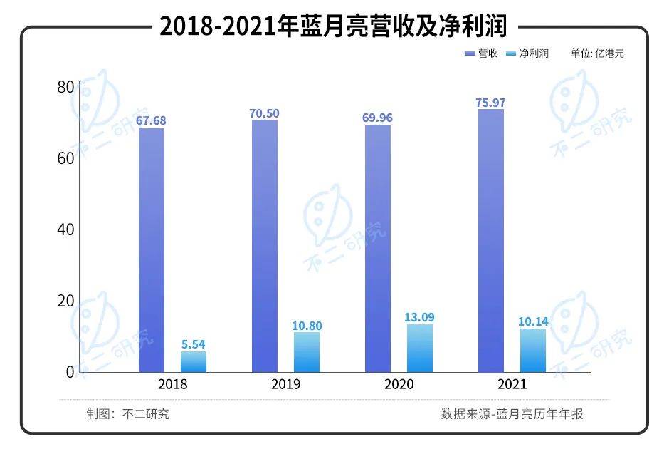 年報顯示,2018年~2021年,藍月亮營收分別為67.68億港元、70.50億港元、69.96億港元和75.97億港元,其中2021年同比增長8.59%;凈利潤分別為5.54億港元、10.80億港元、13.09億港元和10.14億港元,其中2021年同比巨降22.5%,首次打破長期以來的增長趨勢。