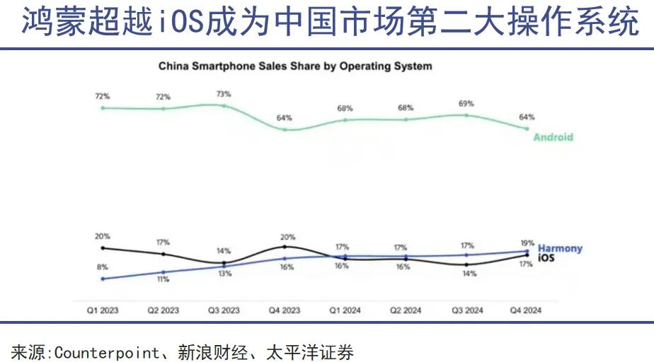 操作系統方面,鴻蒙系統在2024年第一季度就開始超過iOS,成為中國市場第二大操作系統。不過此前鴻蒙系統還依賴安卓內核,但純血鴻蒙上線后,用戶已經突破1000萬,這是真正意義上的一個里程碑。
