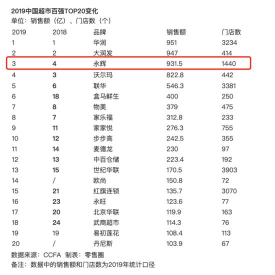 2019年,永輝成功地擠下了沃爾瑪,位列中國超市百強的前三甲。這靠的,絕不是占比僅占10%左右的生鮮電商業務,而是其穩扎穩打的超市業務。